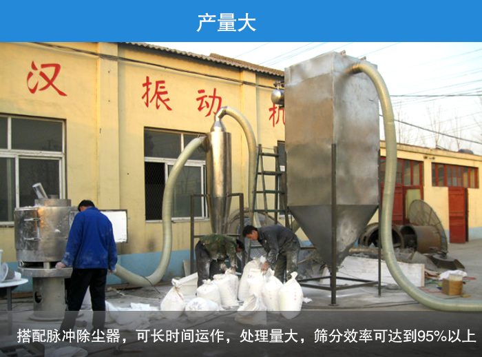 氣流篩分機可以與風(fēng)機并網(wǎng)配套使用,搭配脈沖除塵器,可長時間運作,處理量大,篩分效率可達到95%以上,產(chǎn)量高可以達到每小時10噸,是普通振動篩的5-10倍或更高。