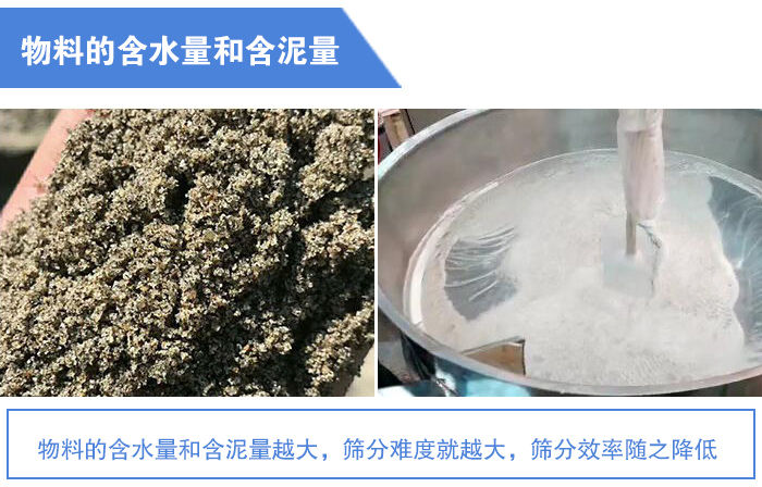 如果物料中包含的表面水分在一定程度內(nèi)增加,那它的粘滯性就會增大,造成細粒互相粘結(jié)成團,并附著在大顆粒上;同時還有物料中包含的粘性物質(zhì),很容易把篩孔堵住。這些都大大降低了篩分效率。