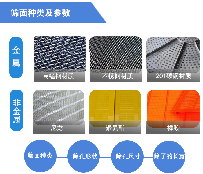 篩子的工作面通常有三種,鋼棒制造的、鋼絲編織的和鋼板沖孔的。它們對篩分效率的影響主要和它們的有效面積有關,有效面積愈大的篩面,篩孔占的面積愈多,礦粒就更容易透過篩孔,這樣篩分效率就會變高,但相對的篩面壽命會較短。因此選擇篩面要根據(jù)實際情況。